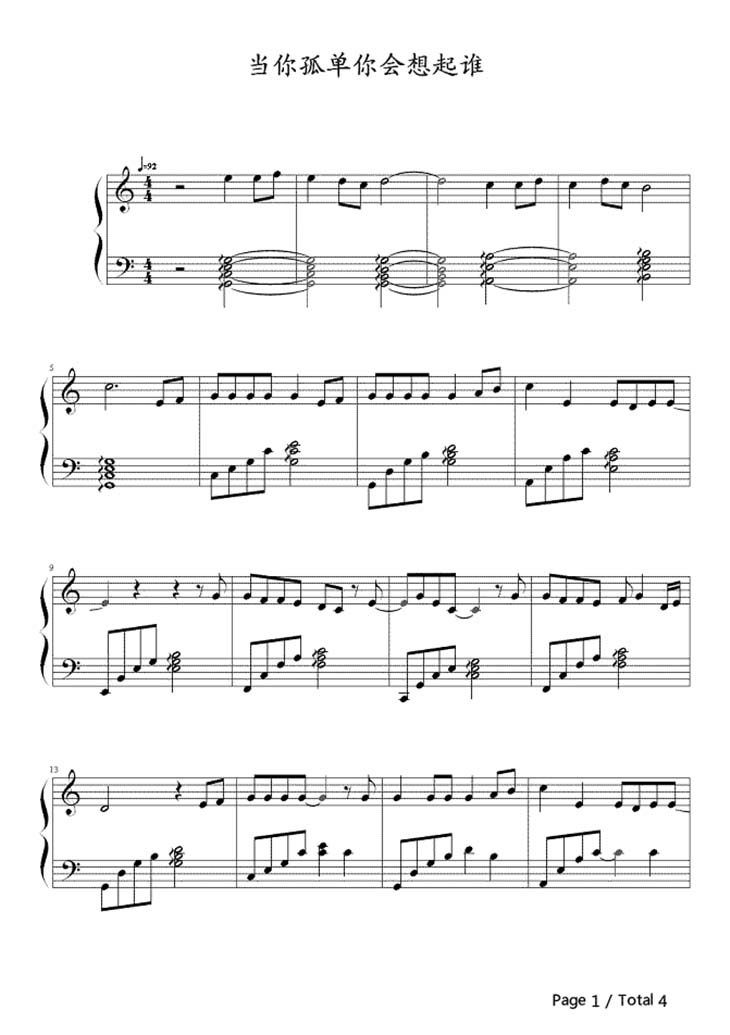 當(dāng)你孤單你會(huì)想起誰鋼琴譜 張棟梁-你總是喜歡在人群中徘徊 你*害怕孤獨(dú)的滋味